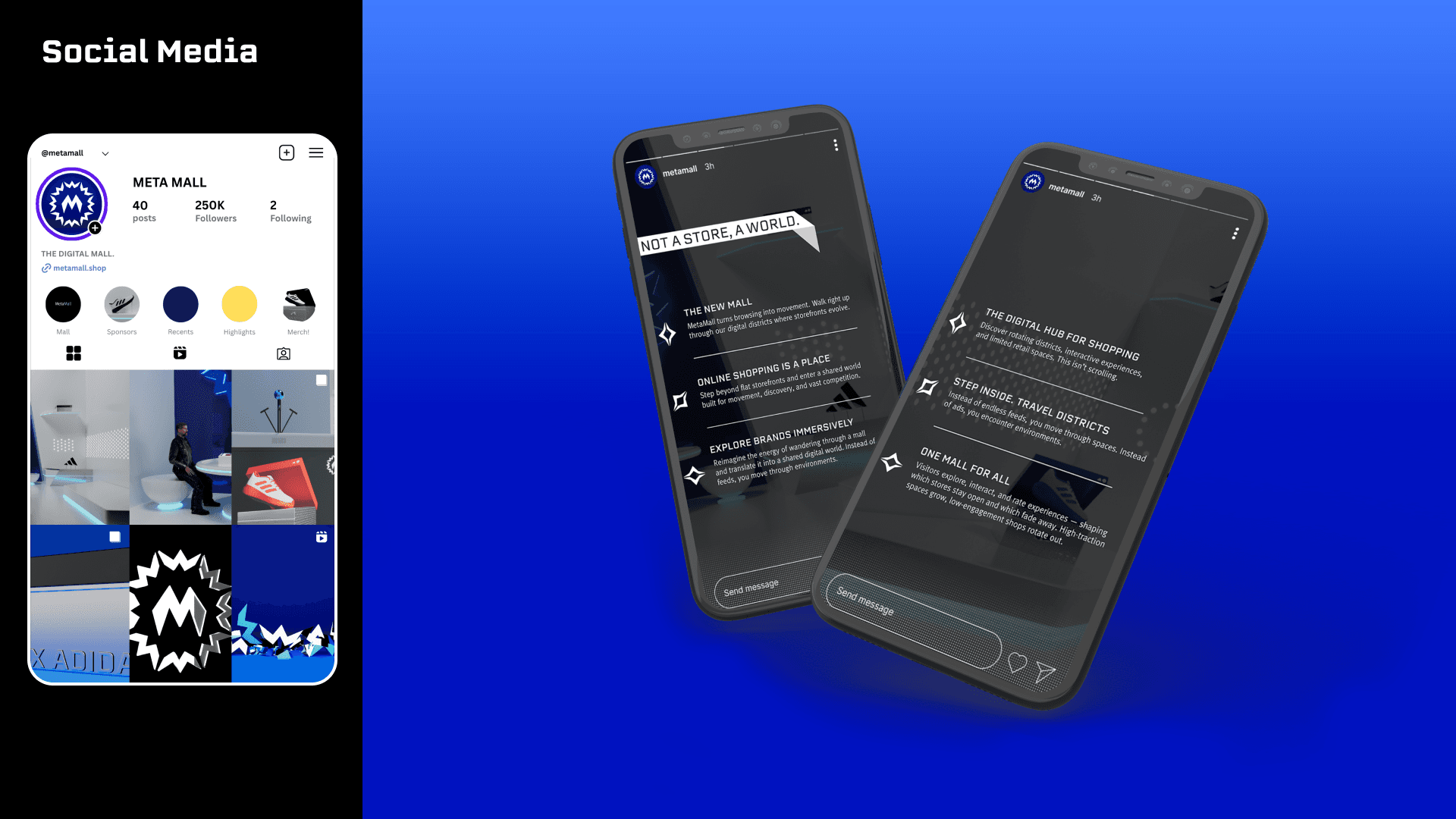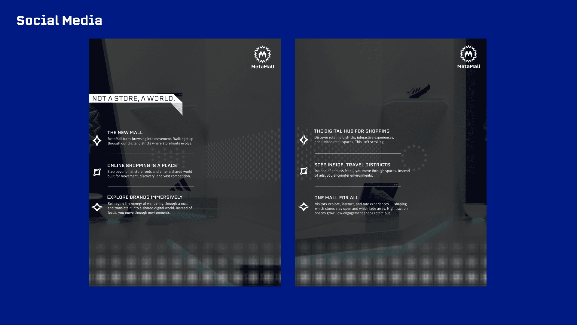 Meta Mall is a shared digital retail world where brands don’t just sell products, they occupy interactive spaces. Instead of isolated websites, companies rent out customizable storefronts within a single immersive environment, where users engagement, ratings & movement directly determine visibility and success.